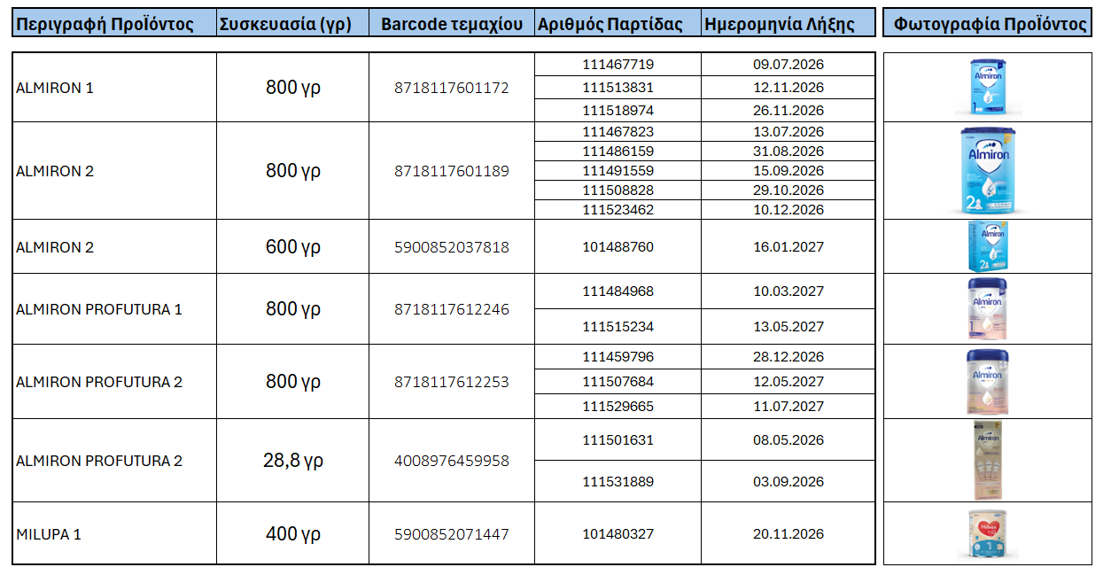 Η εταιρεία η NUMIL HELLAS αποφάσισε να προχωρήσει σε εθελοντική ανάκληση συγκεκριμένων παρτίδων προϊόντων βρεφικού γάλακτος, οι οποίες σημειώνονται στον παρακάτω πίνακα: